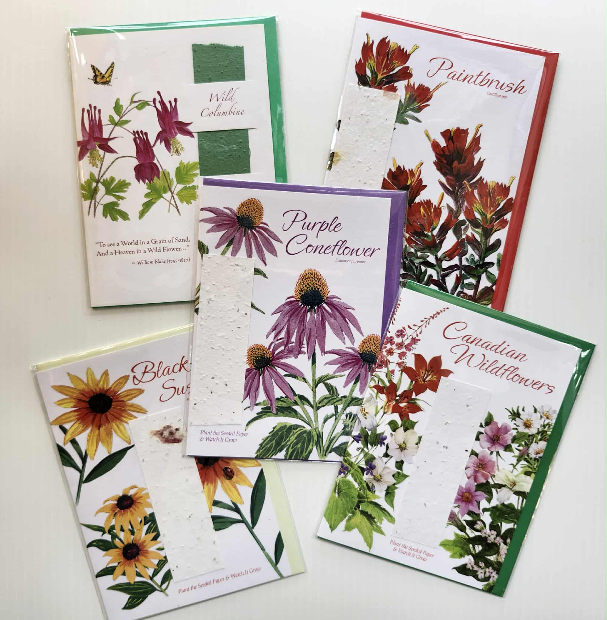 This exclusive series of blank gift cards are designed with a handmade paper insert embedded with seeds from the featured plant and a delicate drawing.