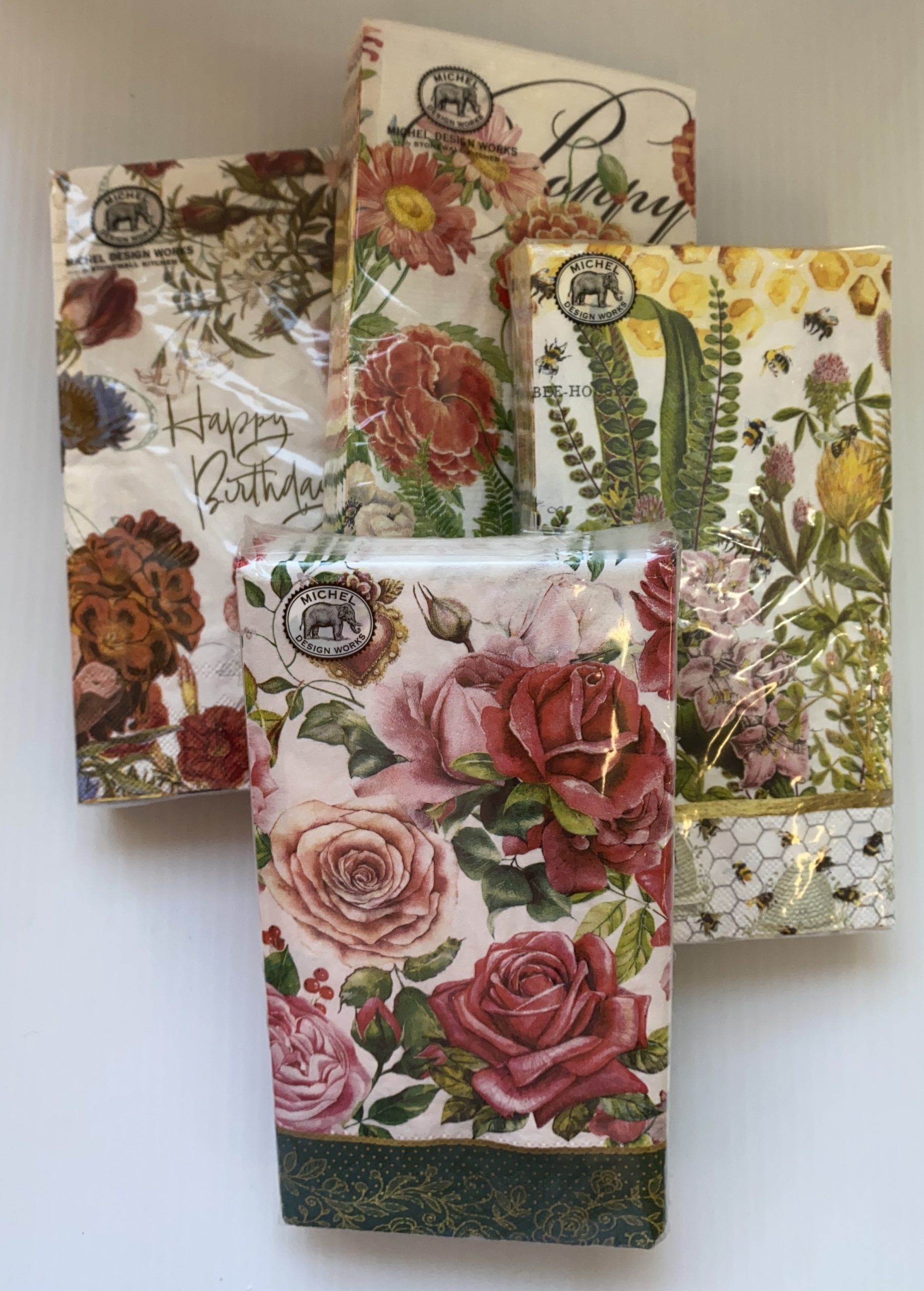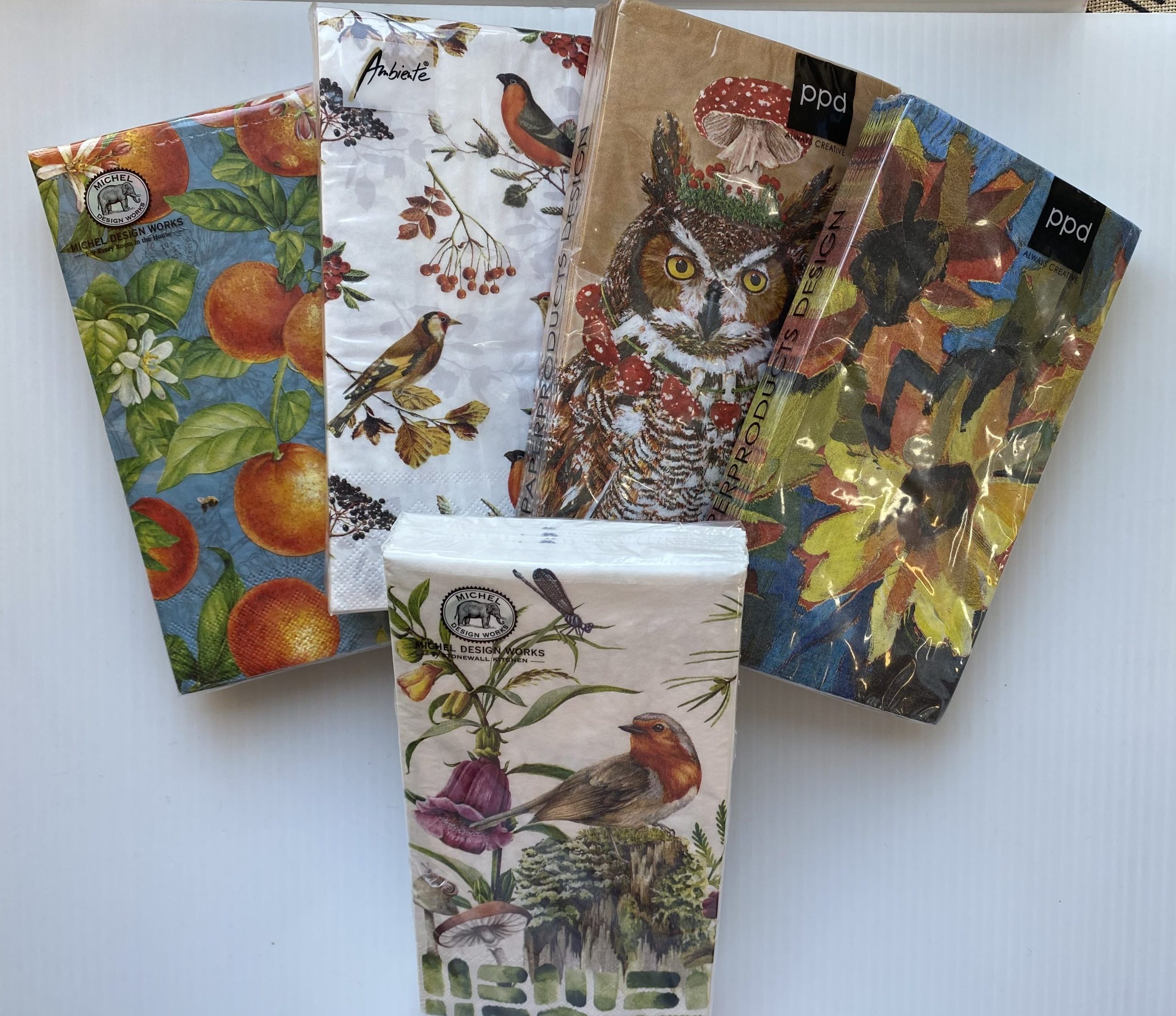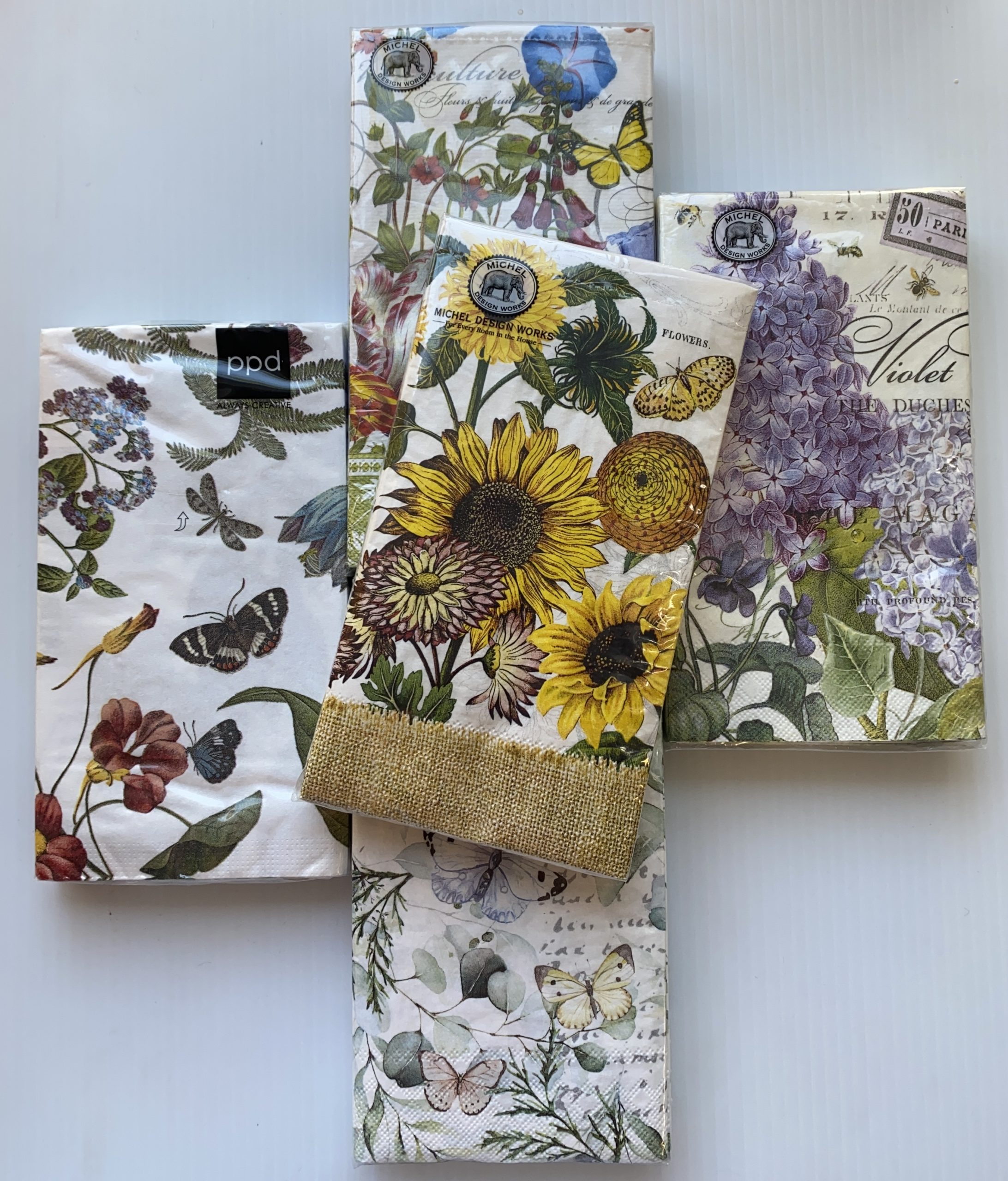 We carry a wide variety of napkins from different suppliers. Too many to itemize on our website. Beautiful quality. Drop by the shop to see the selection.