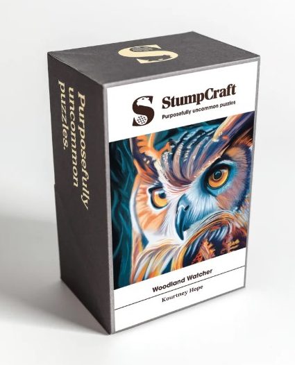 Peer into the captivating gaze of the Great Horned Owl with this exquisite wooden mini puzzle. Woodland Watcher perfectly captures this iconic nocturnal hunter, its fierce aliveness and hauntingly beautiful orange eyes rendered in soft pastels by Canadian wildlife artist Kourtney Hope. Kourtney’s art focuses on Earth’s creatures, brought to life with bold, earthy colours and a strong emphasis on light that infuses each work with soul and vitality.